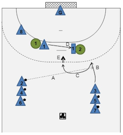 may then try to break through (C) or pass the ball to on the pivot position (D), if the latter was able to gain positional advantage over . - If neither option is possible,