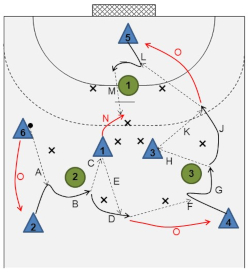 - The wing player passes the ball (A) to the back position player.