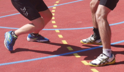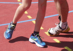- The first two teams of 2 run to the other side in parallel while passing their ball (