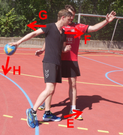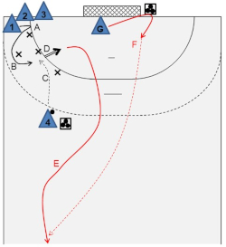 - The goalkeeper should observe the players from the goal center, touch the left post in a well-timed manner (for shots at the right) (F), and then try to save the ball shot at the right side of the goal (G).