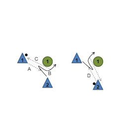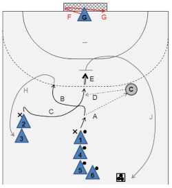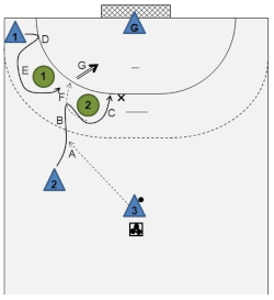 - They pass the ball back to the player on the wing (E) before initiating another crossing (F) and then receiving another return pass (G), and so on.