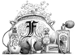At curfew, Hester, Dot, and Anadil trudged back from the common room, piled high with books, only to find their room turned into a laboratory. Dozens of brilliant-colored potions bubbled over open flames, vials of creams, soaps, and dyes littered the shelves, a mess of dried leaves, herbs, flowers blanketed the three beds . . . and in the center of it all sat Sophie, buried under sequins, ribbons, and fabric, testing new concoctions on patches of skin.