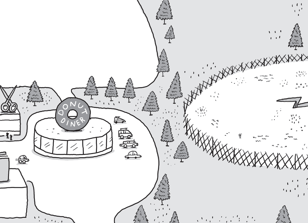 At the end of the road stood a low, round building with an enormous plastic donut sitting on top of it.