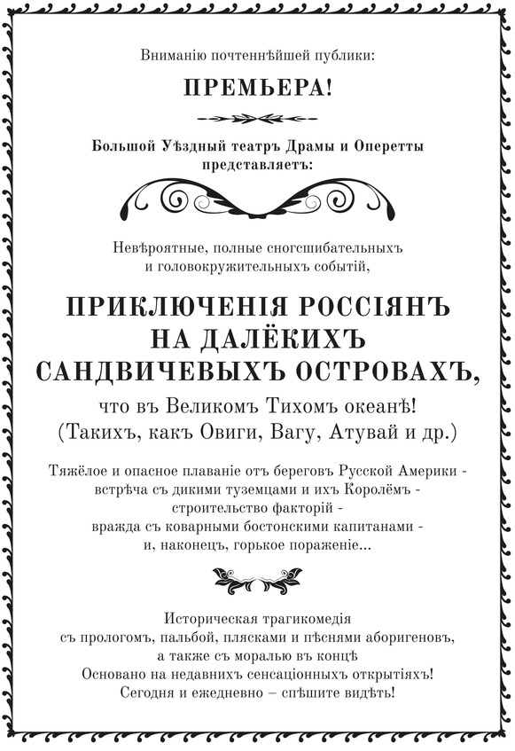 На каждую из подобных премьер зазывала, манила, влекла обязательная афиша – с кричащими заголовками, пикантными обещаниями и скандальными подробностями. Можно не сомневаться: если какая-нибудь труппа Российской Империи вознамерилась бы создать спектакль о миссии Шеффера на Гавайях, то его «постер» в духе времени выглядел бы примерно так – см. иллюстрацию.