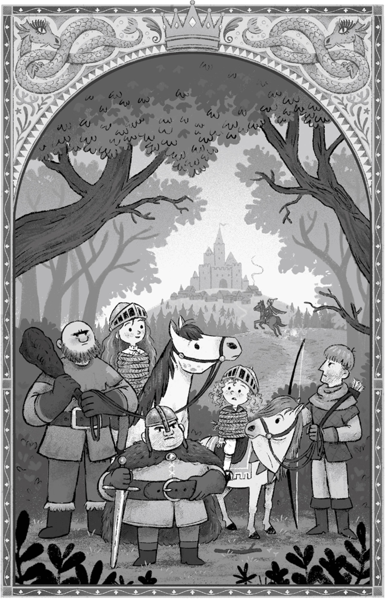 While the first man kept an arrow pointed at Courier’s head, the others took the ponies’ reins and tied Florizella up in knots, before lashing Prince Courier to his saddle. As they turned towards Bennett the prince made his horse rear up on its hind legs; it was just brilliant. The kidnappers jumped back in fright, just for a moment, and Bennett whirled his horse round and dashed away.