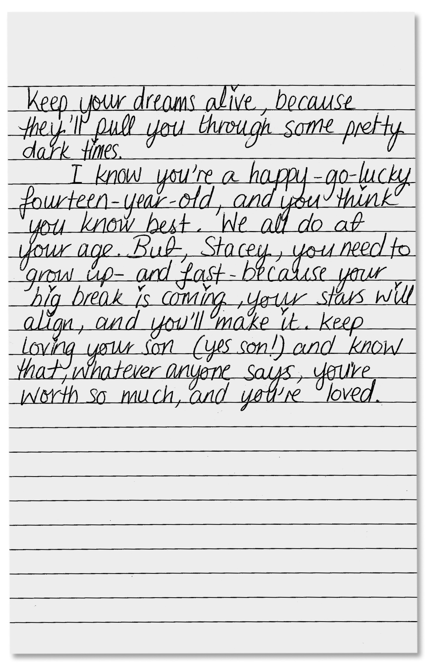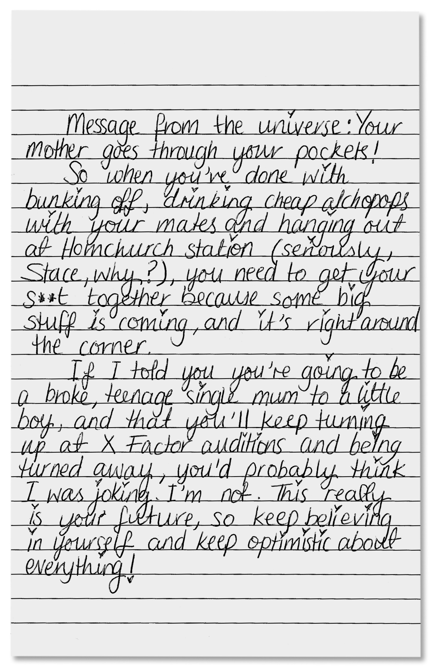 In the moment when all four gave me the thumbs-up, I realized I didn’t need to be perfect: I just needed to be me. Phew! I didn’t have to waste my energy trying to be someone I’m not. Just then it was truly amazing to be me: Stacey Solomon, X Factor contestant, ex fish-and-chip-shop worker, single teenage mum. Just me.