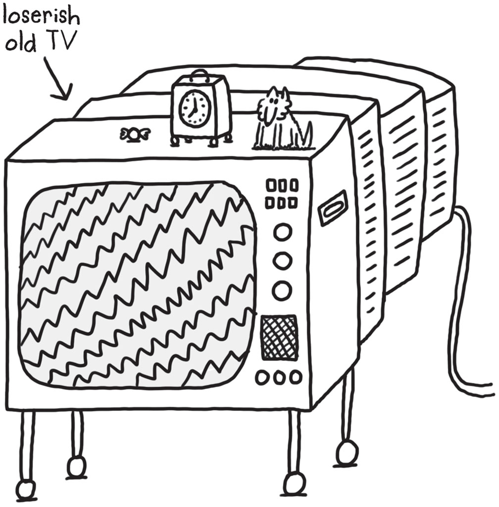 ‘Ooh that’s right, your big brother’s going on a very exciting trip today, Des!’ said my mum. ‘His teacher, Miss Spivak, got a new boyfriend who works at a big flashy TV studio in Hokum City and he’s organised for Barry’s class to see an exhibition about the history of television!’