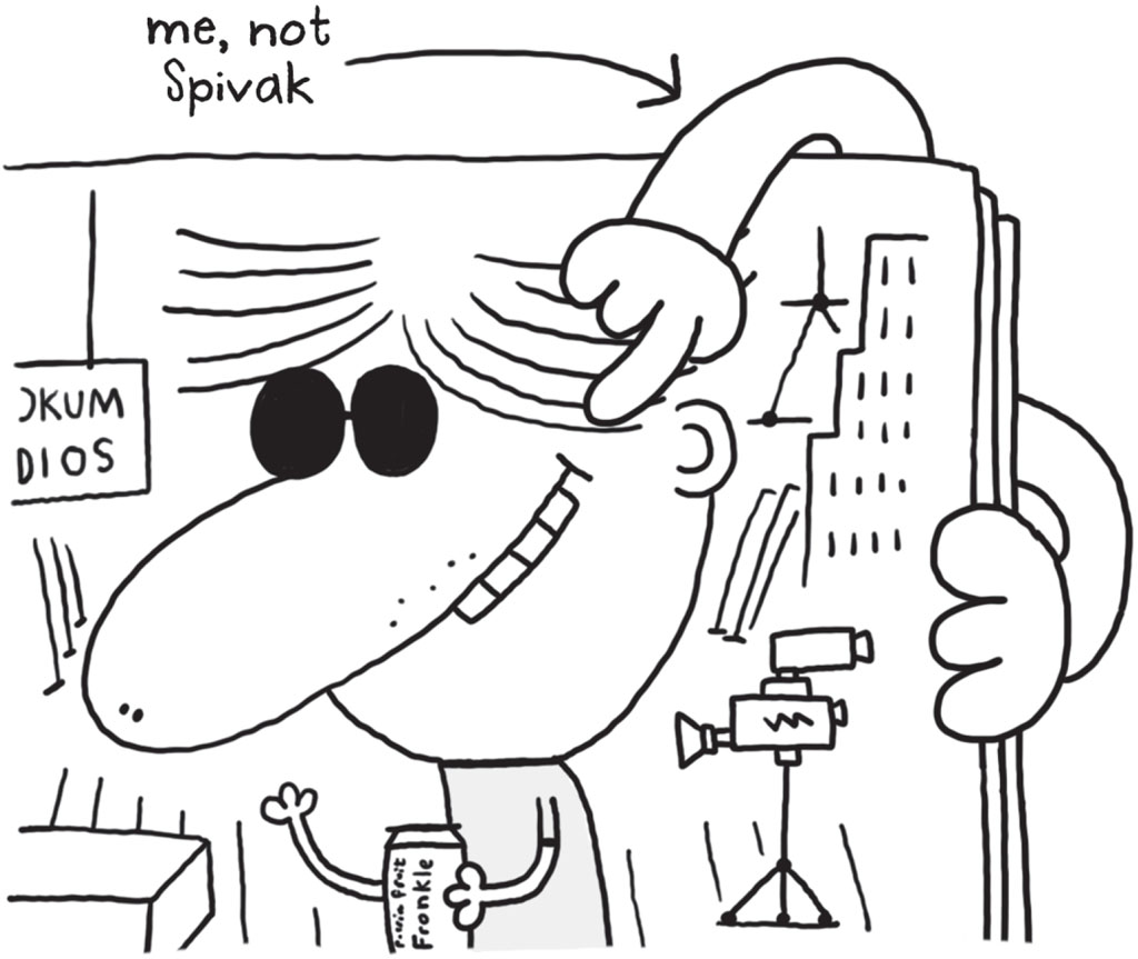 I held my magazine open to the photo of him relaxing on the set of Future Ratboy. He was wearing sunglasses and holding a can of passion fruit flavour Fronkle.