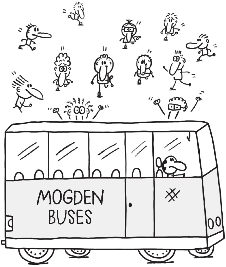 ‘Hey look!’ he cried, pointing up the road, and I spotted a big fat bus sitting outside our school, waiting to take us to Hokum City.