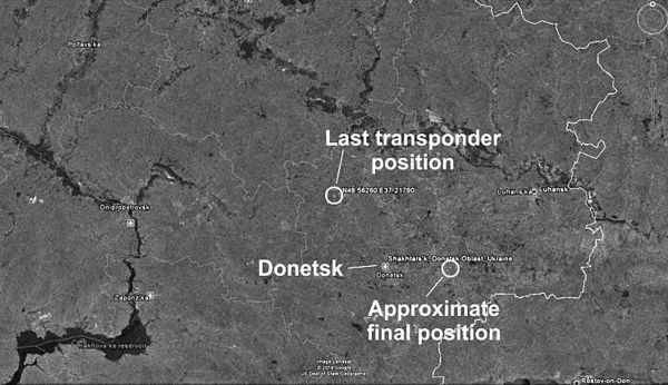 Рис. 4. Маршрут рейса МН 17 16 июля и место нахождения обломков