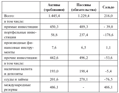 Международная инвестиционная позиция страны – баланс ее требований к другим государствам и ее обязательств перед другими государствами. Разница между требованиями и обязательствами называется чистой инвестиционной позицией страны. Раньше этот документ назывался Балансом международных долгов государства. Он позволяет ответить на вопрос: является ли государство чистым должником перед остальным миром или, наоборот, выступает по отношению к нему чистым кредитором. Из табл. 1 следует, что Россия в настоящее время является чистым кредитором, поскольку ее требования превысили ее обязательства на 216 млрд. долларов. Для сравнения можем сказать, что эта сумма эквивалентна годовому валовому внутреннему продукту (ВВП) таких стран, как Португалия или Казахстан. В значительной мере позицию России как чистого кредитора обеспечивают международные резервы (золотовалютные резервы) Российской Федерации, которые на 1 апреля 2014 года составили 486,1 млрд. долларов. Конечно, та картина, которая представлена в табл. 1, требует некоторых оговорок и уточнений.