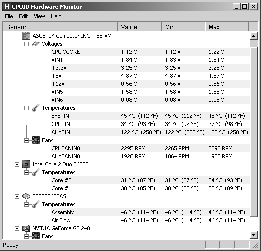 Программы для измерения температуры процессора и материнской платы и, если это возможно, для регулировки оборотов вентиляторов, должны найтись на диске, прилагаемом к материнской плате. Но опыт показал, что такие утилиты обычно избыточны по функциональности, слишком сложны и нестабильны. Потому лучше воспользоваться одной из сторонних программ. Есть много подобных продуктов, и платных и бесплатных, и их нужно тщательно выбирать. Из бесплатных для чистого контроля параметров я порекомендую HWMonitor – очень простую программу, состоящую из единственного исполняемого файла, и не требующую установки, но весьма информативную (рис. 1.5) – как видите, он показывает даже температуру жесткого диска (см. раздел под заголовком ST3500630AS), правда, только одного из двух, имеющихся в компьютере. Кроме того, программа показывает минимальное и максимальное значение за время, пока она запущена. При желании текущие показания можно сохранить в файл и сравнить их, например, с тем, что было до установки нового вентилятора. Скачать последнюю версию HWMonitor можно с сайта разработчиков cpuid.com.