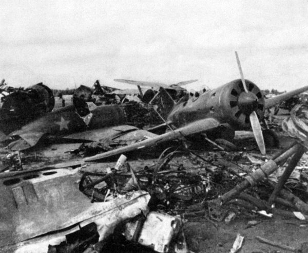 Утром 22 июня 1941 года Германия нанесла сокрушительный удар по советским аэродромам. В результате в первые же часы операции «Барбаросса» на земле было уничтожено и выведено из строя 800 советских самолетов и подорвана значительная часть приграничных складов с боеприпасами и горючим. Вспоминает Герой Советского Союза Сергей Горелов: «На аэродроме было сосредоточено три полка – около двухсот самолетов. Ночью нас начали бомбить. Мы все вскочили, побежали на аэродром, а там… Почти все самолеты были уничтожены или повреждены. Мой И-16 не был исключением. Когда я подошел к нему, мне показалось, что он – скособочившийся, с отбитым левым крылом – как будто смотрит на меня и спрашивает: «Где ходишь? Какого хрена спишь?»