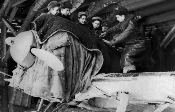 Работы на И-16 и Ил-2 (на заднем плане) в ремонтных мастерских