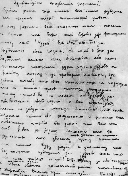 Домой я старался не писать, потому что были случаи, когда разведчик напишет письмо, а тут задание. Его убьют, и не знаешь, посылать ли письмо родителям или нет. Пока оно дойдет, а его уже нет в живых… Поэтому я матери и не писал. Пусть привыкнет, что меня уже нет, лучше будет, когда я потом появлюсь. Хуже будет, если она будет думать, что я живой, а я уже мертвый. Она написала на имя командира роты Военкова письмо – что с моим сыном? Он не пишет, живой или нет. Она обмолвилась: «Трудно потерять мужа, да еще и сына…» Тогда я понял, что отец убит. Военков ей ответил и заставил меня написать письмо.