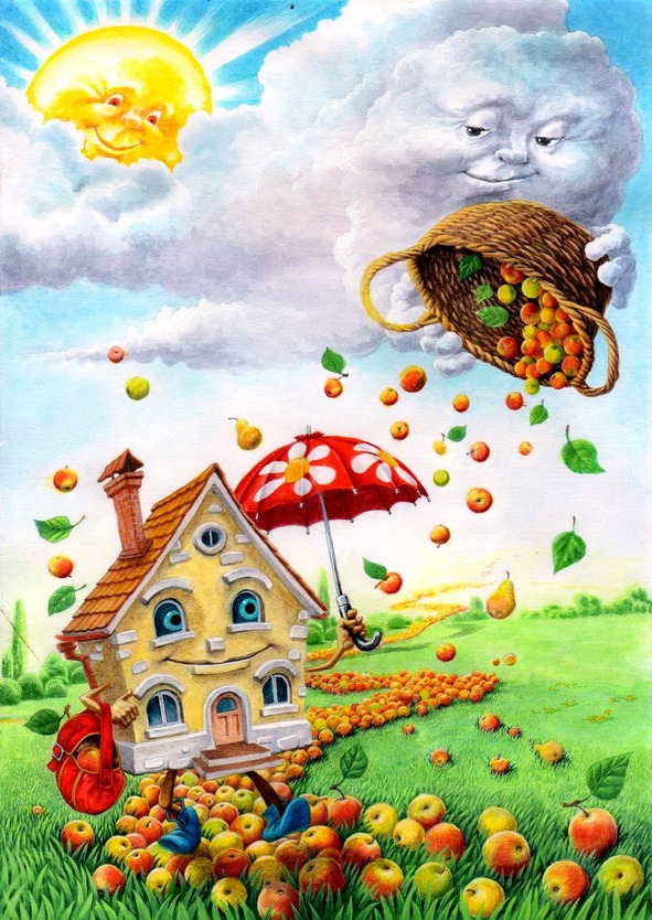 Яблок уродилось много.Если их сложить дорогой,То по этому путиБудет радостно идти.Если их собрать в корзину,И на землю с неба кинуть.То под яблочным дождёмБыстро вырастет наш домВырастут у дома ножки,И по яблочной дорожкеВ путь пойдёт он налегкеС парой яблок в рюкзаке.