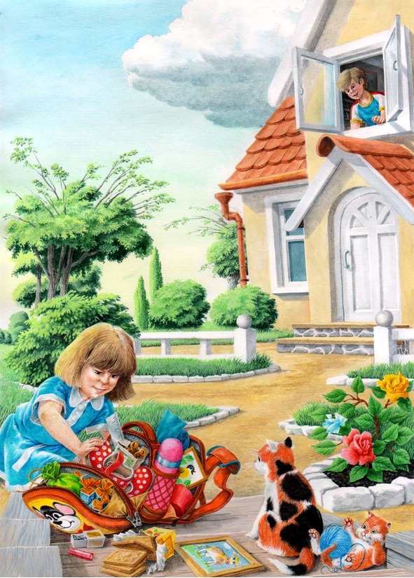 Даше бабушка на рынкеРюкзачок купила.Даша все свои картинкиВнутрь положила.Три печенья, пять конфет,Завтрашний в кино билетТуфли в красненький горошек,И для птичек свежих крошек,И для губ помаду надо,И пол плитки шоколада.Как же Даша без панамки?И без фото обезьянки?Без бантов и без шурупов?И ещё без нужной лупы?Без конвертов и совка?Ох, как ноша не легка!В дальний путь готова Даша,В рюкзачке есть ложка даже.Будет переход нелёгкимВ дом соседний к другу Лёвке.