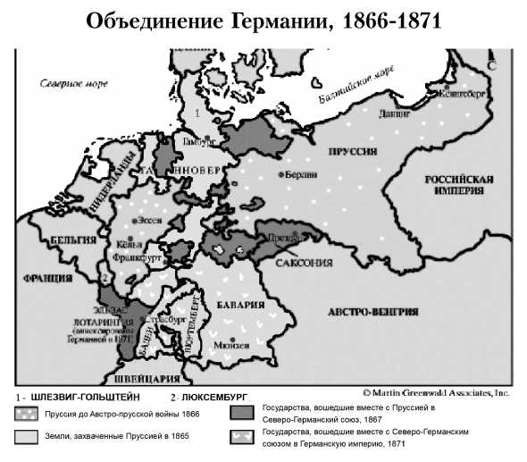 Динамичная протестантская Пруссия стремилась ко владычеству в Германии. После победоносной для нее Австро-прусской войны 1866 года, Германский союз был распушен, на смену ему пришел Северогерманский союз под главенством Пруссии.[18] Он оставался конгломератом княжеств с разными традициями и обычаями, в том числе политическими. Создать единое государство помогла Франко-прусская война 19 июля 1870-го – 2 мая 1871 года.