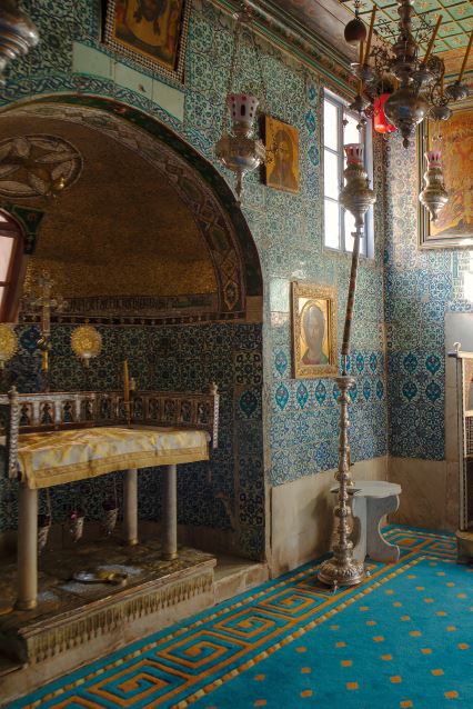 План базилики был бы вполне традиционным: прямоугольник с выступом алтарной апсиды и пятью изолированными приделами вдоль каждой стены. Но два из них – святого Иакова, брата Господня, и Сорока синайских и раифских мучеников – выдвинуты на восток дальше, чем главный алтарь, и соединены полукруглым выступом еще одной апсиды. Из придела Сорока мучеников мы подходим к этому внутреннему алтарю за главным алтарем, сокровенному, как Святое Святых древнего Иерусалимского храма, куда только раз в год входил первосвященник.