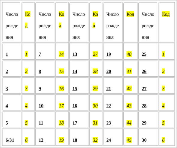 Второй инструмент – это совокупность матрицы и уровней развития. Ниже вы найдете таблицу, которая поделена по шести уровням на матричные коды. Найдите свое число рождения, напротив него будет стоять матричный код, который соответствует вашему числу рождения.