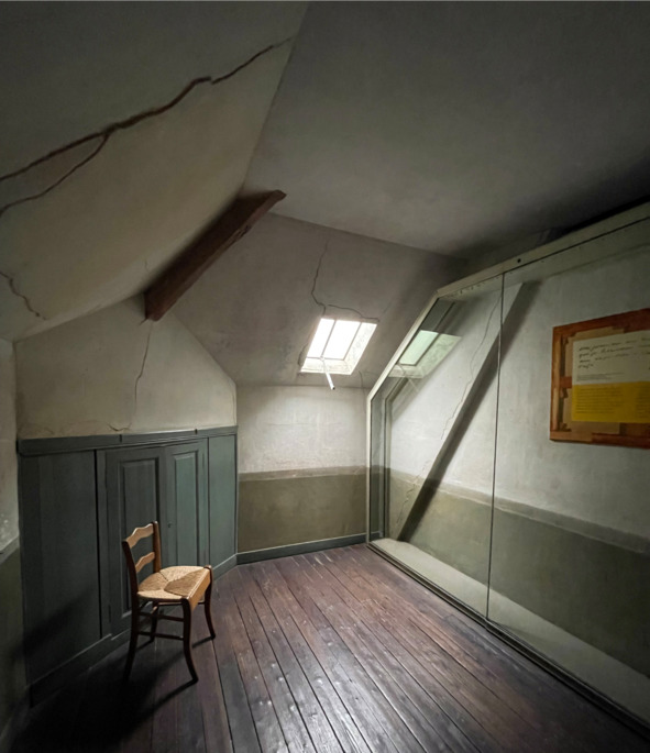 Май 1890-го года. Ван Гог в Овере начинает жить в маленькой, семь квадратных метров комнатке гостиницы Оберж-Раву недалеко от мэрии. Комната на верхнем этаже, окно в крыше. Место только для кровати, столика и стула. На первом этаже бар-столовая. Прожил Ван Гог в Овере 70 дней, написав за это время более 70-ти холстов.