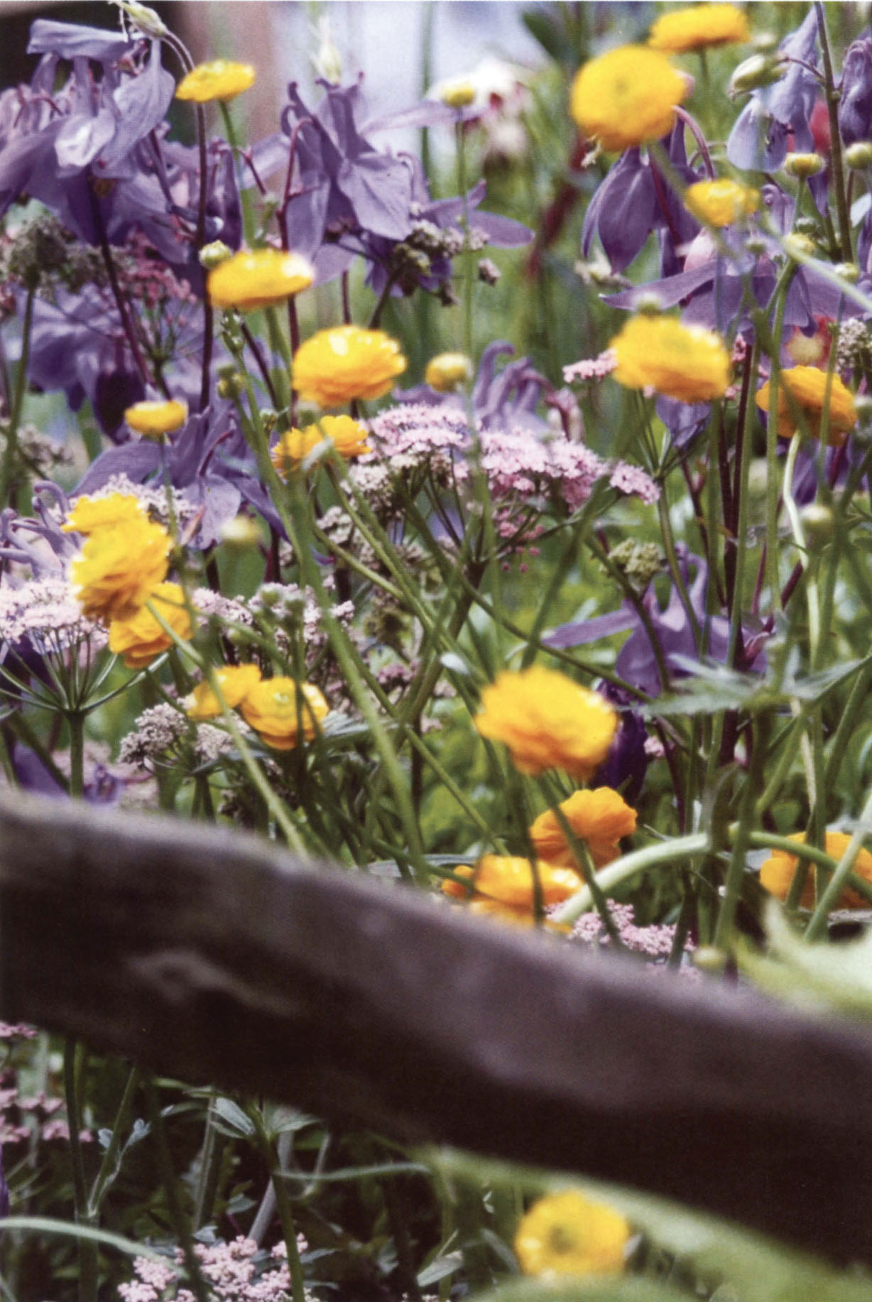 Blue Aquilegia ‘Hensol Harebell’, double flowered buttercups (Ranunculus acris ‘Flore Pleno’) and the soft pink flowers of Pimpinella major ‘Rosea’ combine to evoke that romantic, cottage garden look.