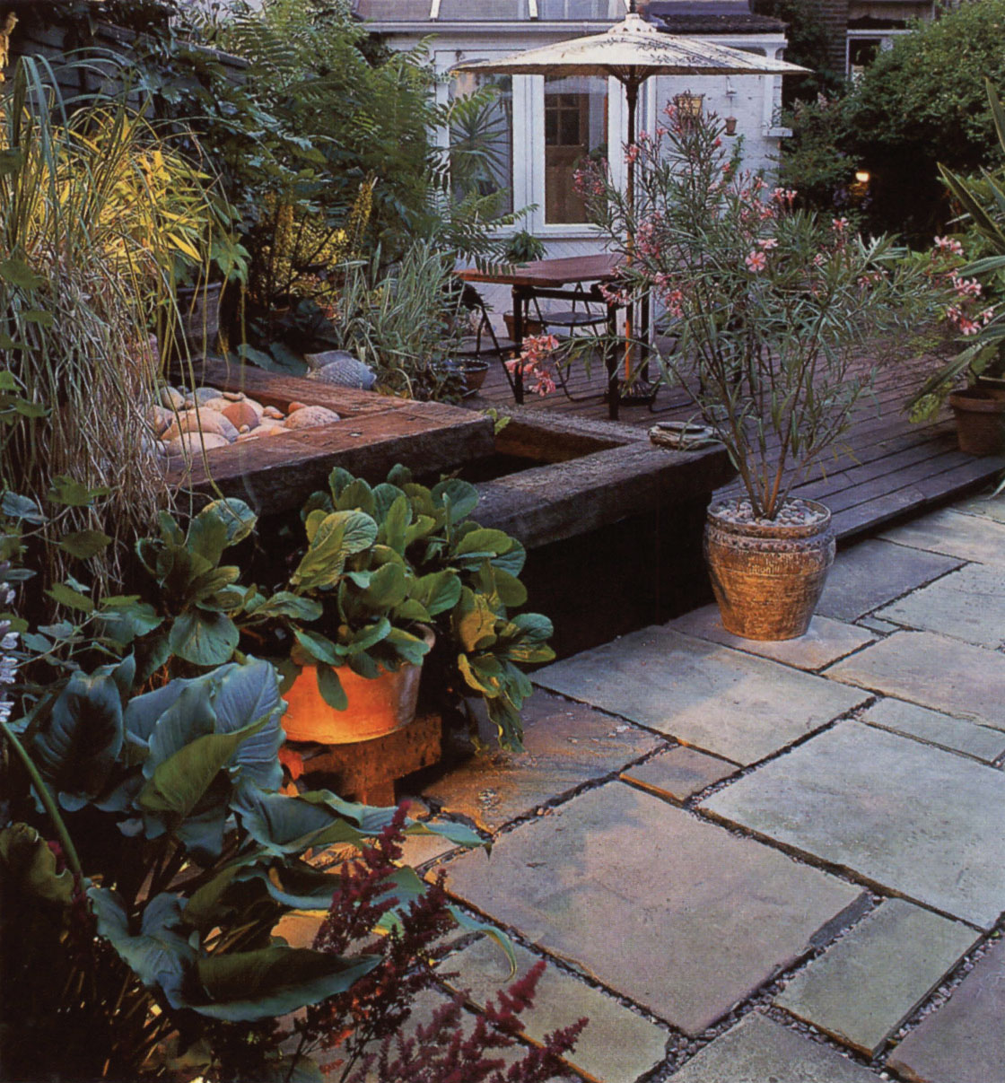 Possibly the furthest away from the cottage garden is a tropical style garden. Even in a climate not especially associated with heat, a tropical style is surprisingly easy to achieve. However, it looks best in an urban situation and works very well with modern furniture and accessories. Tender plants such as bananas and cannas will require some extra care to overwinter them, but it is well worth the effort.