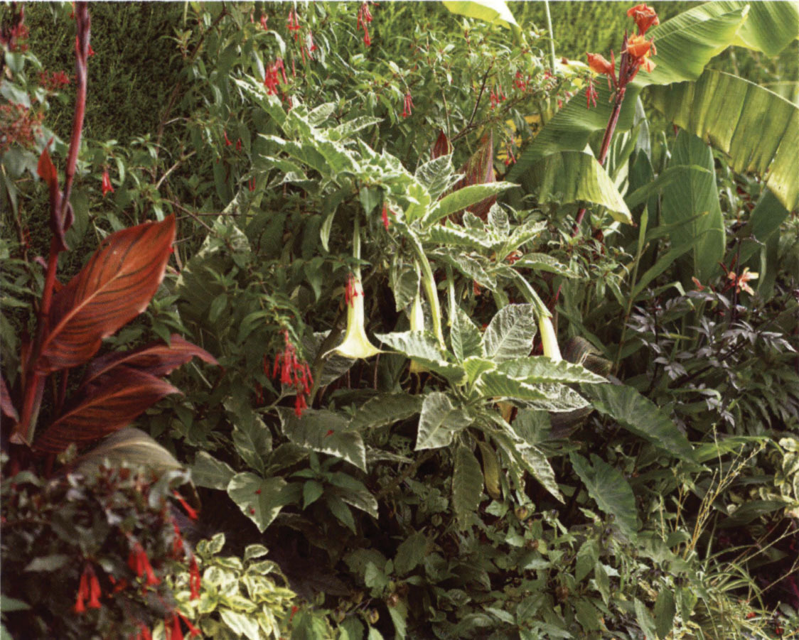 Even in a cool climate, a summer planting of tender plants creates a tropical effect. A variegated brugmansia and purple-leaved cannas provide both attractive foliage and flowers – but they will need winter protection from frosts.