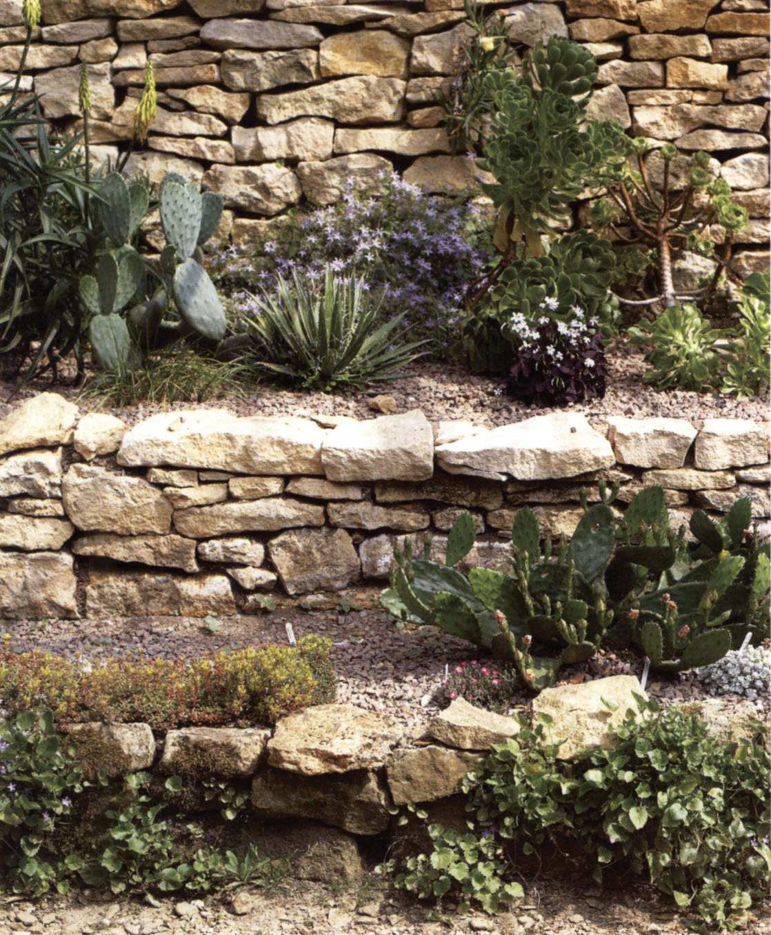 Excellent drainage and full sun is essential for these succulents. Aeonium arboreum, opuntia and aloe add that Mediterranean feel to any planting.