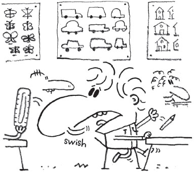 ‘I’m not with them!’ shouted Bunky out of the window as we parked, and he got out and zoomed off like a talking hoverpoo, not that it mattered because his first lesson was with me and Mr Hodgepodge anyway.