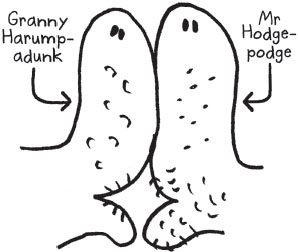 I closed my eyes to stop myself being sick and tried to tiptoe past, but what with Bunky doing his hoverpoo impression and me tripping over Granny’s empty milk bottles, and Mr Hodgepodge kissing Granny with his eyes open anyway, it didn’t really work.