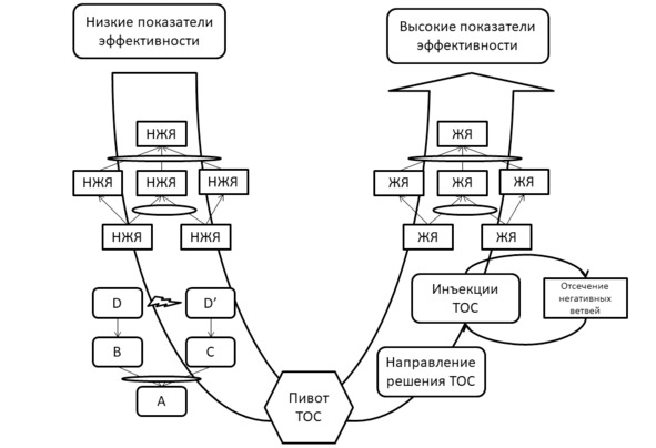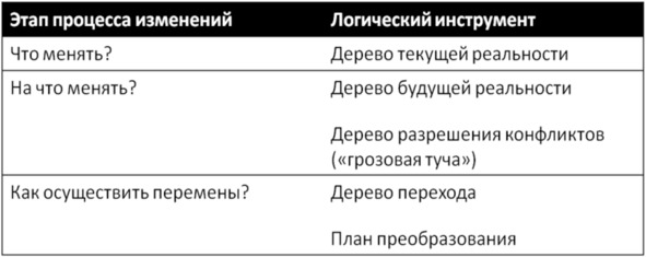 Выход за пределы чисто «логистических» проблем, необходимость учета особенностей поведения людей для начала и в процессе осуществления изменений привели к качественному скачку в развитии инструментов Теории ограничений. Появилась необходимость в создании и представлении способов, которые бы позволяли выявить причины, приводящие к нежелательным явлениям25; показать причинно-следственные связи, которые приводят к текущим не всегда удовлетворительным результатам; а также дать инструмент разработки и обоснования решений и планов изменения, с помощью которых можно было бы убедить людей в работоспособности и реализуемости решения. Это особенно важно, потому что часто действия, включенные в решения Теории ограничений, не вписываются в общепринятую в компании и даже отрасли парадигму.