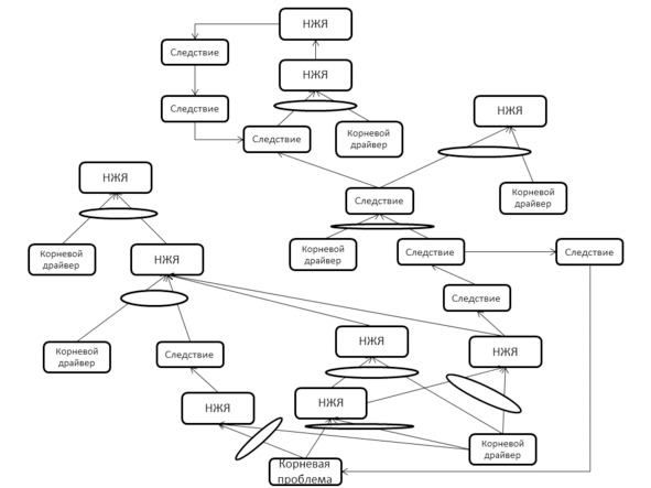• Дерево текущей реальности – это диаграмма, основанная на причинно-следственной логике необходимости и достаточности, которая облегчает поиск ответа на вопрос «что нужно изменить?», показав связь между нежелательными явлениями и корневой проблемой. Нотация дерева текущей реальности выглядит следующим образом: