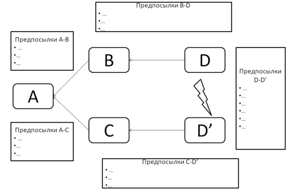 На стрелках диаграммы мы фиксируем логические обоснования, почему для достижения результата, указанного у конца стрелки, нам необходимы действия или условия, указанные у ее начала. Задача разрешения конфликта в конечном итоге сводится к поиску такого способа действия D*, который бы обеспечил одновременное достижение обязательных условий В и С.