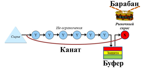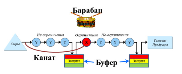 • Барабан – то, что задает ритм работы всей системы, очевидно, что это работа ограничения. Ритм, скорость, с которой работает ограничение, задает темп всей системе. Точно так же, как скорость каравана определяется скоростью самого медленного верблюда, так и производительность всей системы определяется производительностью ограничения. Всем остальным звеньям нет необходимости работать на максимуме своей производительности. Потому что если они будут действовать таким образом, то объем незавершенного производства в системе будет только нарастать, что, в силу неотвратимой логики закона Литтла, начнет приводить к ухудшению работы всей системы.