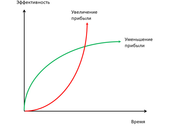 В рамках ТОС это формулируется в виде «зеленой и красной кривых» – набора из двух кривых, которые отражают ментальные установки на уменьшающуюся отдачу (зеленая кривая) как противоположность увеличивающейся отдачи (красная кривая) относительно целей организации. Позднее зеленая кривая стала иллюстрацией цели стабильности, а красная начала использоваться для иллюстрации цели постоянного роста.