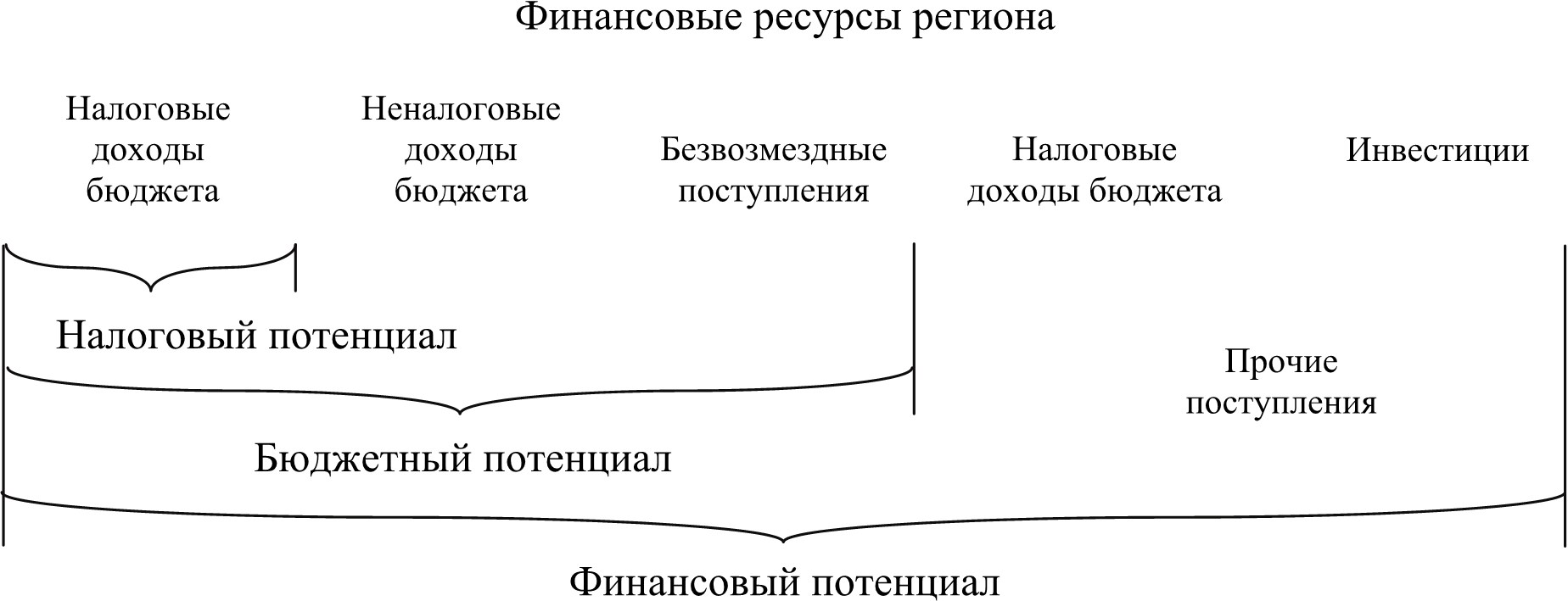 Структурно-иерархическая модель потенциальных финансовых ресурсов является ключевым звеном в системе теоретических представлений о способах реализации основного принципа бюджетного выравнивания – гармонизации потребностей в бюджетных услугах и возможностей финансовой базы территорий. Формализованная оценка финансовых потенциалов призвана восполнить пробел в формировании информационно-аналитической базы о влиянии различных факторов на результаты бюджетного процесса.