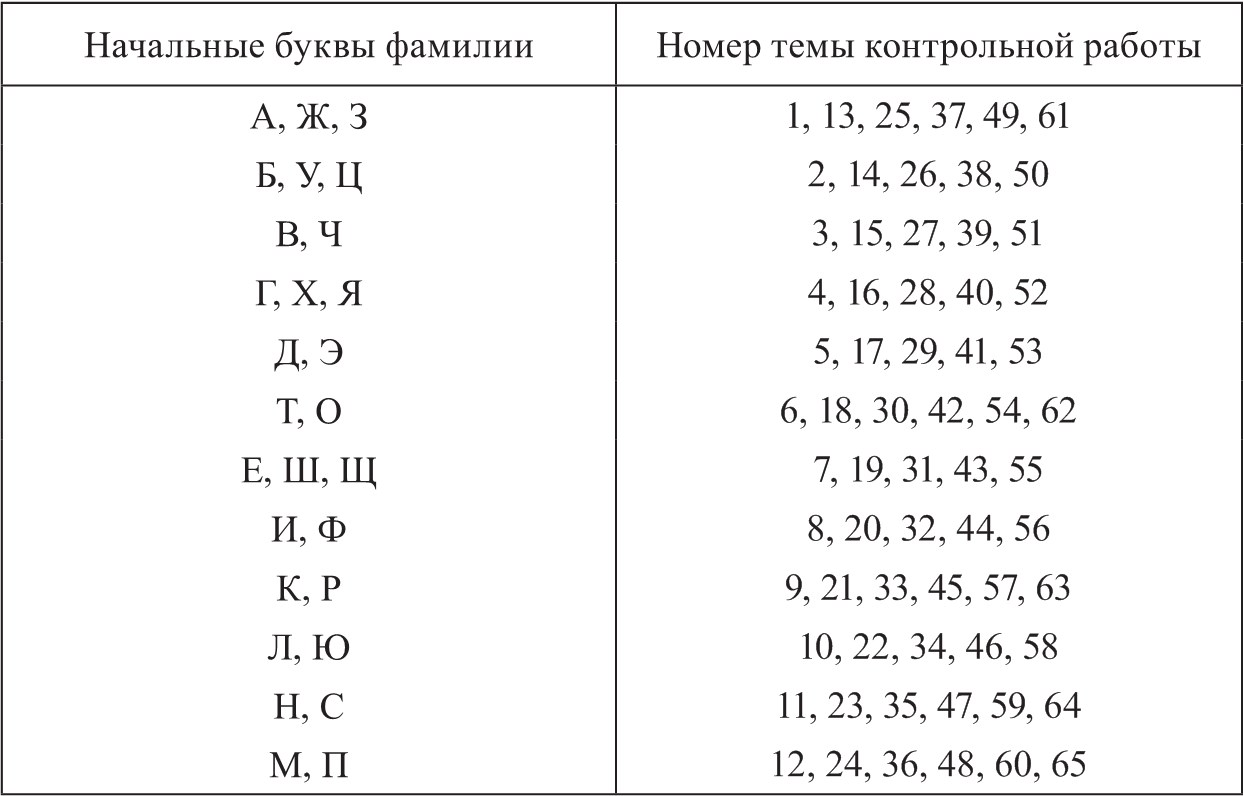 Студенты выбирают тему контрольной работы в зависимости от первой буквы своей фамилии. Например, студент Петров. На букву «П» студент выбирает одну из тем, предложенных в таблице (12, 24, 36, 48, 60, 65). Выбор другой темы возможен только с согласия преподавателя. Контрольная работа, выполненная по теме, избранной с нарушением изложенных правил, не зачитывается.