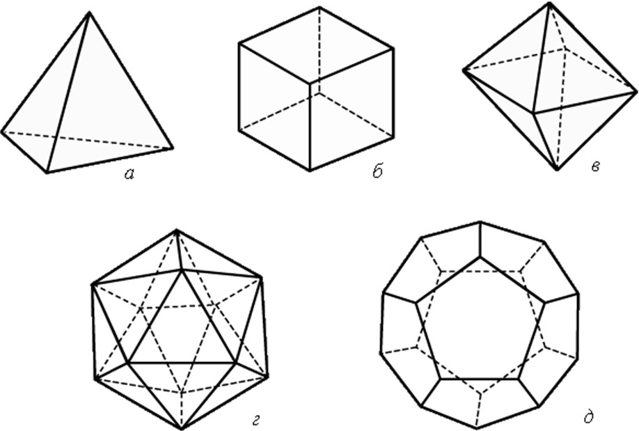 Рис. 1. Платоновы тела: а – тетраэдр; б – куб; в – октаэдр; г – икосаэдр; д – додекаэдр