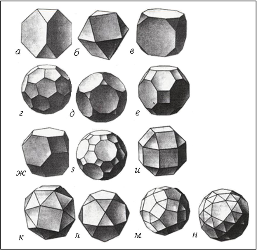 Рис. 2. Архимедовы тела: а – усеченный тетраэдр; б – кубооктаэдр; в – усеченный куб; г – усеченный икосаэдр; д – усеченный додекаэдр; е – усеченный кубооктаэдр; ж – усеченный октаэдр; з – усеченный икосододекаэдр; и – ромбокубооктаэдр; к – дважды усеченный куб (курносый куб); л – икосододекаэдр; м – ромбоикосододекаэдр; н – дважды усеченный додекаэдр (курносый додекаэдр)