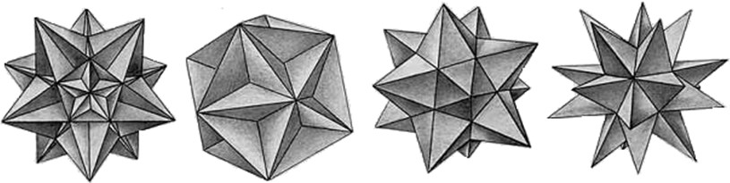 Кроме правильных и полуправильных многогранников красивые формы имеют звездчатые многогранники. Правильные звездчатые многогранники получаются из правильных многогранников путем продолжения их граней и ребер. Их всего четыре, и называются они телами Кеплера – Пуансо (рис. 4).