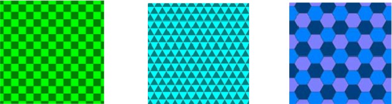 Тесселяции, известные также как покрытие плоскости плитками (tiling), являются коллекциями фигур, которые покрывают всю математическую плоскость, совмещаясь друг с другом без наложений и пробелов. Правильные тесселяции состоят из фигур в виде правильных многоугольников, при совмещении которых все углы имеют одинаковую форму. Существует всего три многоугольника, пригодных для использования в правильных тесселяциях. Это правильный треугольник, квадрат и правильный шестиугольник (рис. 5).
