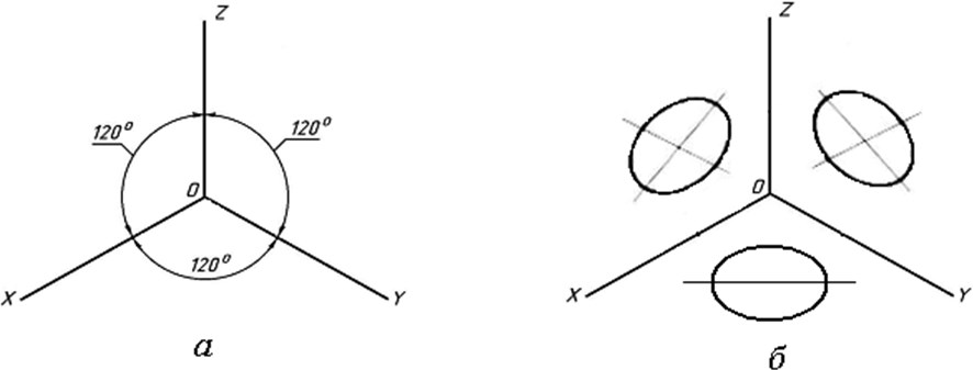 Рис. 11. Изометрическое проектирование: а – расположение осей координат; б – расположение окружностей