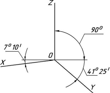 Для прямоугольной диметрической проекции ось OZ вертикальна, другие две оси наклонены к горизонтали: OX – под углом в 7°, а ОУ – в 41° (рис. 12). При таком проектировании получают изображение, увеличенное в 1,06 раза по сравнению с натуральным.