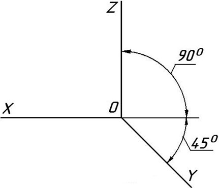 Фронтальная диметрическая проекция характеризуется тем, что OZ вертикальна, ОХ горизонтальна, а ОУ направляется под углом в 135° к каждой из этих двух осей (рис. 13).