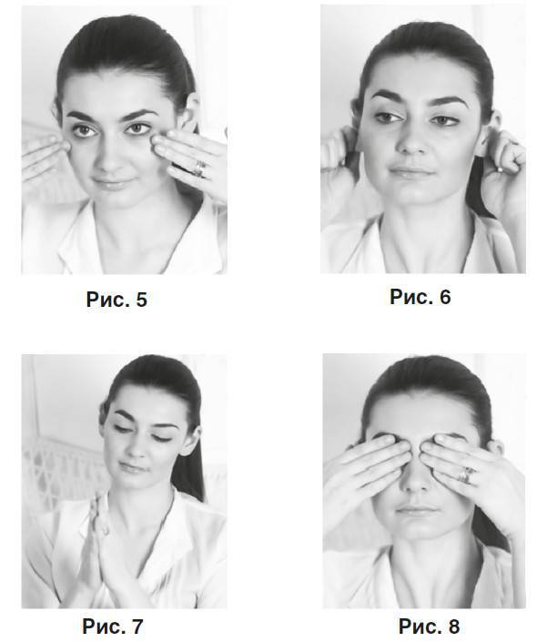 Начинайте гимнастику с легких круговых массирующих движений от макушки головы, затем по массажным линиям поглаживайте все лицо (рис. 1–5). Не забывайте массировать мочки ушей (рис. 6), этим вы стимулируете сразу весь организм. Очень полезно и приятно потереть ладони друг о дружку, приложить их к глазам, не надавливая, и немного подержать (рис. 7–8).