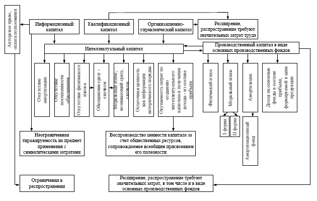 В отличие от основных производственных фондов, ценность которых воспроизводится в амортизационном фонде и кроме того на нее начисляется прибыль в составе цены и выручки от реализации продукции, ценность интеллектуального капитала воспроизводится дифференцировано по его видам: