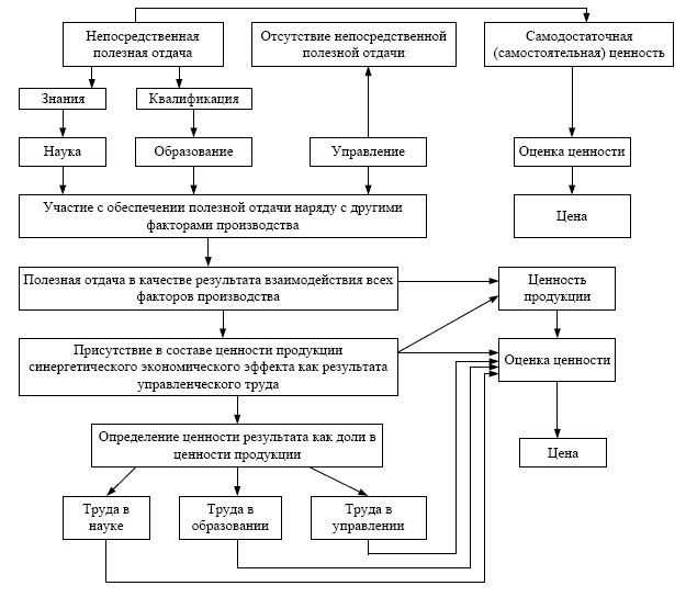 Во-вторых, в составе ценности созданной продукции присутствует синергетический, иначе говоря комбинационный экономический эффект как результат комбинирования факторов производства, выраженный в том, что скомбинированное в эффективную систему взаимодействие факторов производства, воплощенное в созданную продукцию, являет собой в виде этой продукции большую ценность, чем механическая сумма ценностей всех потребленных факторов производства. Именно в этом, с позиции образования ценности, проявляется ведущая роль организационноуправленческого труда по сравнению с другими видами труда, в том числе в науке и образовании. Пусть, в отличие от двух последних видов труда, труд в управлении не создает конечный продукт, обладающий самостоятельной ценностью, но зато он обладает особой долей в составе ценности конечной продукции той системы, которой он управляет. Эта особая доля соответствует величине синергетического экономического эффекта. Правде, научные открытия и изобретения также порождают такой эффект, но это порождение носит промежуточный характер, а управленческий труд создает данный эффект в качестве своего конечного результата.