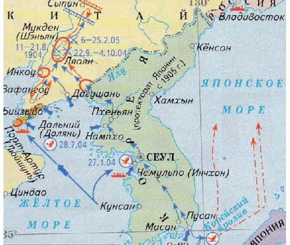 N-Japanese war of 1904—1905 becomes the catalyst for many subsequent revolutionary events. The initial psychological reason for the confrontation with the ambitious Eastern Power is as follows. During a trip to Japan, Nicholas II receives saber blows from a samurai, who believes that excessive honor is given to a foreign emperor. The attacker dies three months after the sentence is pronounced (life imprisonment), but the monarch harbors a fierce grudge against all Japanese. The external reason is the unrestrained advance of the Russian troops in Korea, the construction of military fortifications, contrary to the treaties with Japan. In addition, the intention of the samurai to saddle the 450 millionth China and lay the foundation of the world superpower with unclear objectives, causes the desire to somehow stop them. Before that, in the First Japanese-Chinese War, as well, for control over Korea, the Japanese gain experience in waging war at sea with armored ships. In the autumn of 1894, a battle will take place at the mouth of the Yalu River (north-west coast of Korea), with approximately equal forces (12 and 18 pennants, respectively). Japan has 4 ships seriously damaged, 100 people killed. China loses 5 sunk cruisers, and 650 sailors. The Qing Empire wins the battle – drives the Japanese squadron away from the transport ships. However, fearing new demoralizing losses, the government of the Celestial Empire forbids the fleet to go to sea. In early 1895, the battle for Weihaiwei (now the administrative district of the PRC) will take place. The Japanese attack the surrounded Chinese fleet (27 pennants, two battleships of Italian construction), destroy it completely, together with 2000 sailors, losing 200 fighters and 2 destroyers. A serious shortcoming of the Chinese fleets is the lack of high-explosive fragmentation projectiles. Available armor-piercing pigs inflict minimal damage to the enemy. Russian officers do not bother themselves with a detailed analysis of instructive battles of the “Asian powers”. The photo shows a map of the alignment of forces and major battles of the Russo-Japanese War