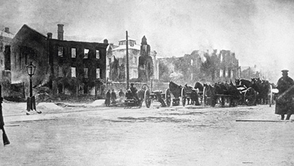 One and a half months after the formation of the first convocation of the Duma, from December 20, 1905, two then-friendly parties, the RSDLP b) and the Left Social Revolutionaries, organized a political strike in Moscow. The main idea of Lenin and his associates – “the worse, the better.” No agreements with opponents or even possible allies, a boycott of the legislature, a course on terror and an armed uprising. 150 thousand people go on strike. Not working transport, institutions, shops. From December 22, government troops use artillery against militants blocked in the building. City authorities, as well as the townsfolk, withdraw from participation in the opposition. The rebels are supported by merchants – the Old Believers. The struggle of 8 thousand military men and 2 thousand Bolsheviks, Socialist-Revolutionaries, and Caucasian students lasts 10 days. The losses of the rebels – 1 000, government troops – 120—130. As a result of this gradually fading small civil war, until 1911, 18,000 people were killed on both sides. Photography – artillery shelling barricades in the Presny area. The picture is apocalyptic. Moscow, December 1905
